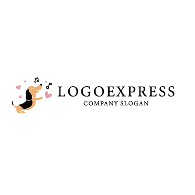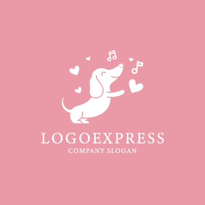 可愛らしいダックスフントが音楽とハートに囲まれて楽しそうにしているロゴです。