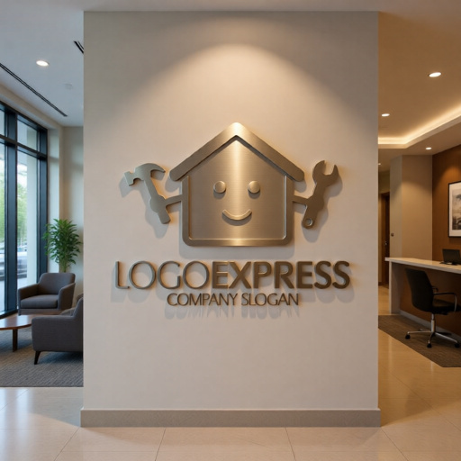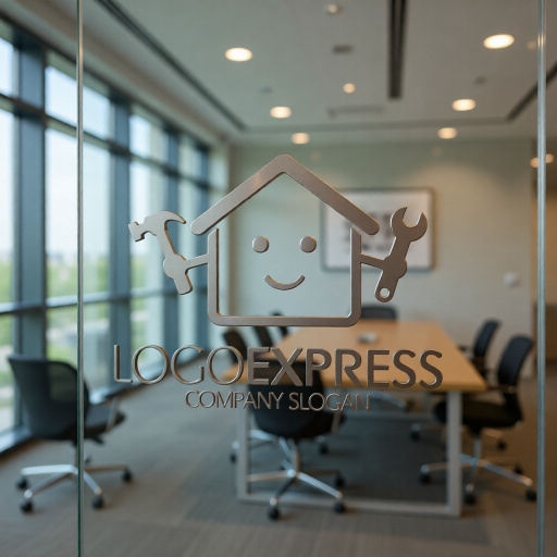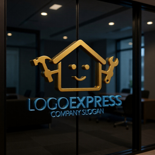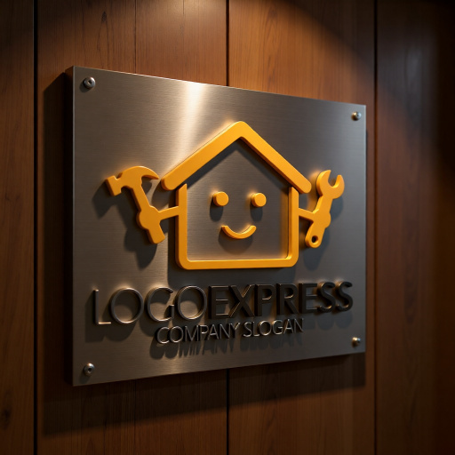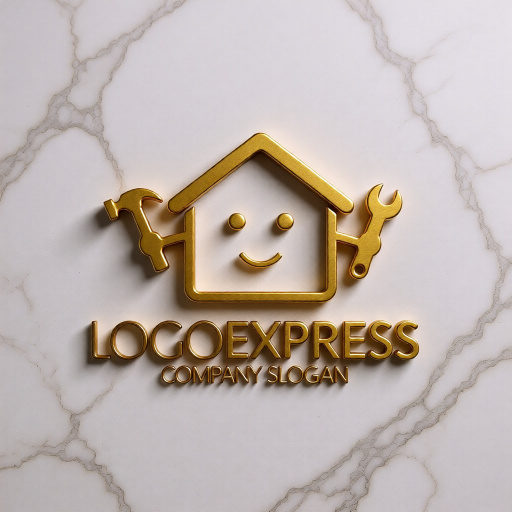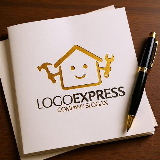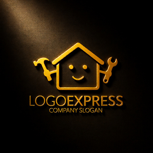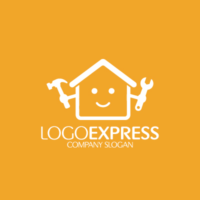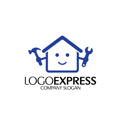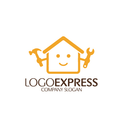 このロゴは、笑顔の家がハンマーとスパナ(またはレンチ)を持っている、親しみやすく信頼感のあるデザインです。