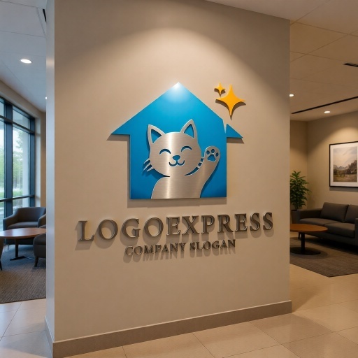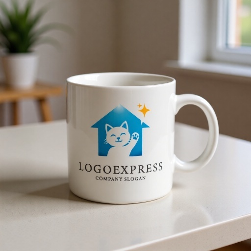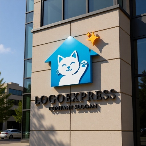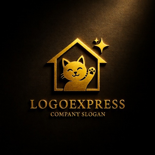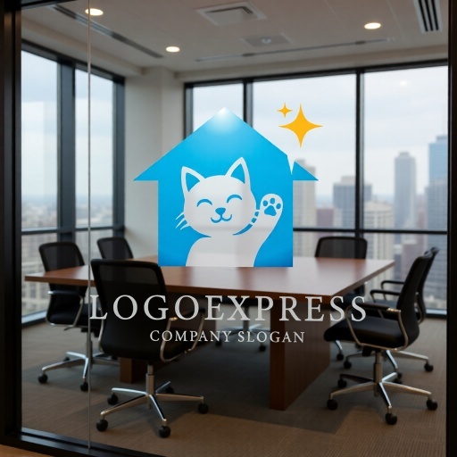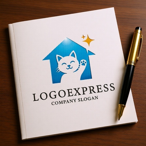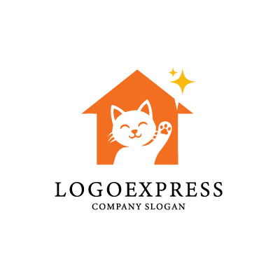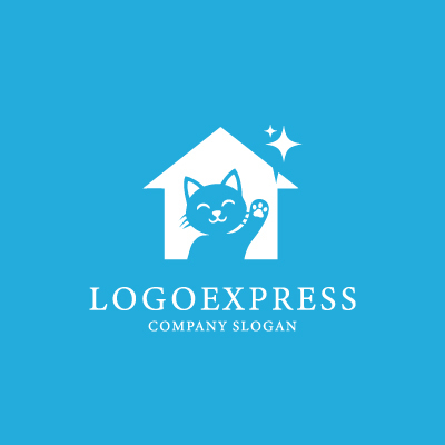 家の形は、ペットにとっての安全で安心できる居場所、安定した環境、そして保護を象徴します。家の中から顔を出し、手を振る(または招く)猫は、愛らしさ、幸福、満足感、癒し、そして歓迎を表現し、ペットとの幸せな暮らしや、顧客を温かく迎え入れる企業の姿勢を示します。また、招き猫のイメージは、商売繁盛や幸運をもたらす縁起物としても機能します。上部に輝く星は、品質の高さ、清潔感、卓越性、新鮮さ、そして新しい始まりへの希望を象徴します。青色の家は、信頼性、清潔感、穏やかさ、そしてプロフェッショナリズムを、白い猫は純粋さを、黄色の星は活気、幸福、輝きを象徴し、企業が持つ信頼性と顧客への温かいサポートを強調します。ペットショップ、動物病院、ペットホテル、ペットシッター、保護猫活動を行うNPO、ハウスクリーニング、子供向けサービス、ペット可の不動産、ライフスタイルブランドなど、ペットへの愛情、安心感、清潔さ、そして幸福をアピールしたいあらゆる業界に最適です。