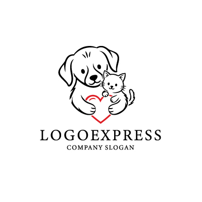 犬と猫が寄り添い、中央のハートを抱える姿は、深い愛情、友情、家族の絆、そしてペットへの献身的なケアを象徴します。このロゴは、顧客とその大切なペットに安心感と幸福をもたらす企業の温かい心遣いを表現します。ハートは愛と優しさを、犬と猫の丸みを帯びた表情は親しみやすさを伝えます。シンプルな線画に赤色のハートが加わることで、モダンでありながらも感情豊かな印象を与えます。ペットショップ、動物病院、ペットサロン、ペットフードメーカー、動物保護団体、子供向け商品、家族向けサービスなど、ペットへの愛情、絆、そして優しいケアをアピールしたいあらゆる業界に最適です。