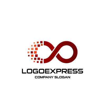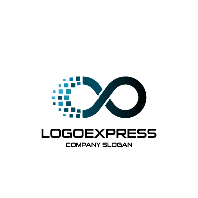 無限大のシンボルが、左側でデジタルピクセルに分解されている、モダンでテクノロジーを感じさせるロゴです。