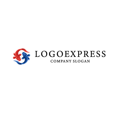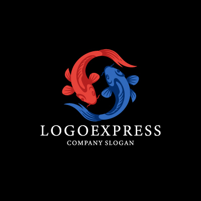 赤と青の鯉が互いに絡み合い、陰陽のシンボルを形成する、調和と繁栄を象徴するロゴデザインです。