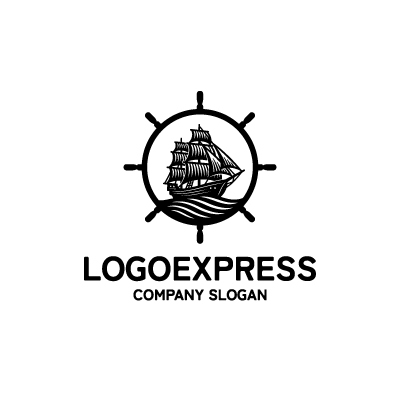 伝統的な帆船をモチーフに、それを舵輪が囲むように配置した、航海と信頼を象徴するロゴデザインです。