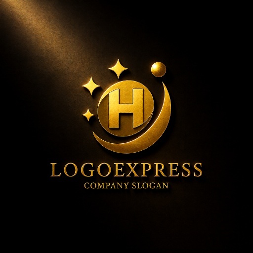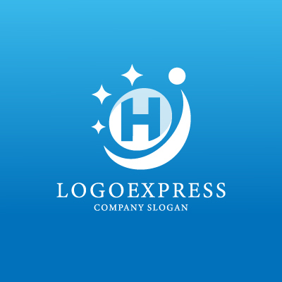 円形の中にアルファベットの「H」を配置し、周囲を流れる曲線と輝く星々が特徴のロゴデザインです。