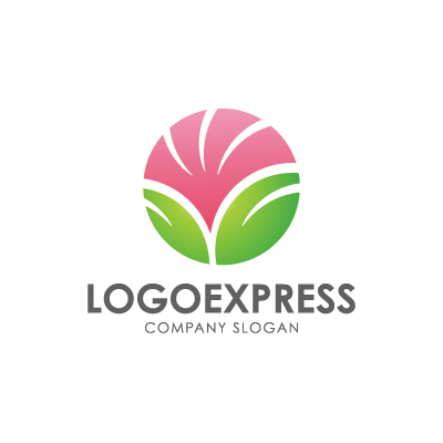 このロゴは、円形のフォルムの中に、ピンク色の花びらと緑色の葉が美しく配置されたデザインです。