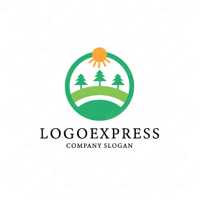 太陽と自然を円の中に描いたロゴ [3388]