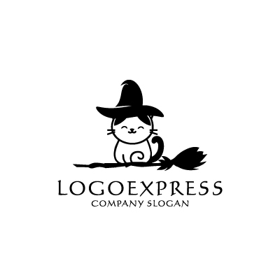 魔法使いの帽子をかぶった可愛らしい猫がほうきに乗っている、遊び心あふれるロゴです。