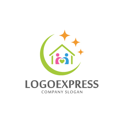 家は、安心感、温かさ、そして家庭的な価値を象徴し、企業が顧客に対して温かさと信頼感を提供することを示唆します。家の中にいる二人の人物は、家族、繋がり、そして愛情を象徴し、温かい家庭環境を提供することを示唆します。弧は、包容力、調和、そして成長を象徴し、企業が顧客や社会との繋がりを大切にし、共に成長していくことを表します。星は、希望、夢、そして未来への展望を象徴し、企業が常に新しい可能性を追求し、明るい未来を目指していることを示唆します。緑、青、ピンクの組み合わせは、調和、信頼、愛情、そして希望を象徴し、顧客に安心感とポジティブな印象を与えます。不動産会社、住宅建設会社、インテリアデザイン会社、福祉関連企業など、安心感、愛情、そして希望をアピールしたい業界に最適です。