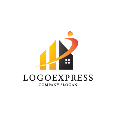家は安定した住まいや基盤を、グラフのようなバーは成長や資産価値の上昇を象徴しています。躍動感のあるスウッシュは、人の活力、サポート、あるいは企業のダイナミックな発展や顧客への積極的なアプローチを表します。黄色やオレンジはエネルギーと成長、暖かさを、黒は安定と信頼性を示唆します。不動産、住宅販売、建設、不動産投資、資産管理、住宅関連サービス、ファイナンシャルプランニング、あるいはイニシャルが「H」の企業などに最適です。