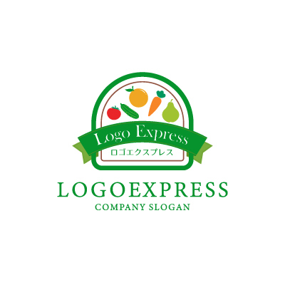 野菜と果物は、健康、栄養、そして自然を象徴し、企業が提供する商品の品質と安全性を表します。緑色は、新鮮さ、安心感、そして環境への配慮を象徴し、企業が顧客に対して提供する健康的な商品と持続可能な取り組みを表現します。リボンのデザインは、伝統、品質、そして信頼を象徴し、顧客に対して長年培ってきた信頼と高品質な商品を提供する姿勢を表します。八百屋、食品販売会社、レストランなど、新鮮さ、健康、そして自然をアピールしたい業界に最適です。
