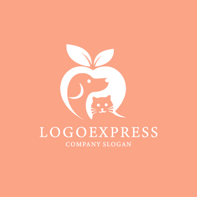 ハート型の桃の中に、犬と猫が仲良く寄り添う姿をデザインした、愛情あふれるロゴです。