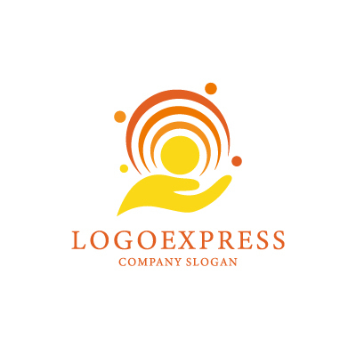 温かい黄色い手は、慈愛、サポート、そして人との繋がりを象徴し、その上で輝く黄色い丸は、成長する個人やコミュニティの姿を表現しています。上部に広がるオレンジ色の弧とドットは、希望、活力、ポジティブなエネルギーの拡散、そして広がる影響力を意味し、見る人に安心感と幸福感を与えます。このロゴは、医療、福祉、教育、子育て支援、NPO法人、ウェルネス、コンサルティングなど、人々の成長、幸福、そして温かいサポートを重視する幅広い業界に最適です。