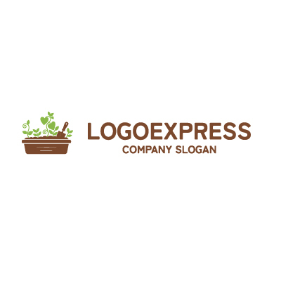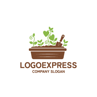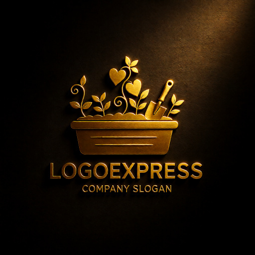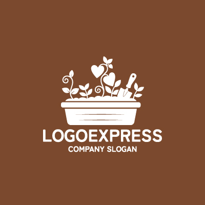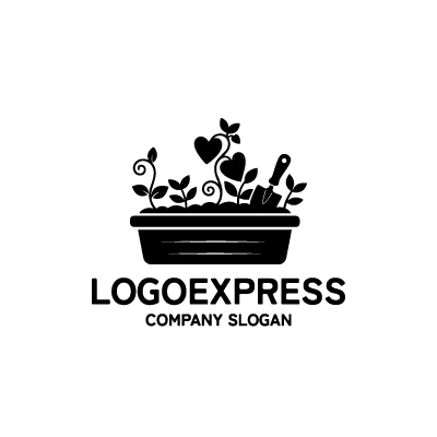 プランターに植えられた様々な植物、ハート型の葉、そして小さなシャベルが描かれた、愛情と成長を感じさせるロゴです。