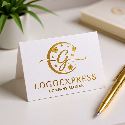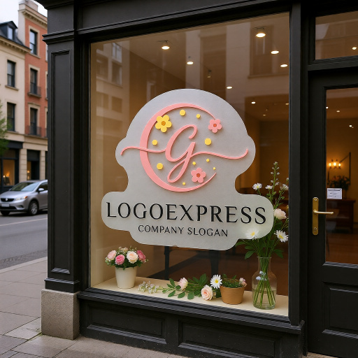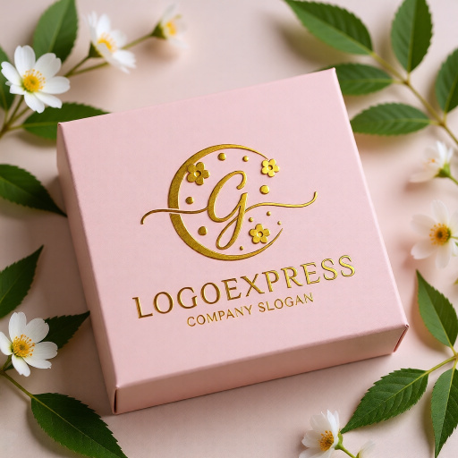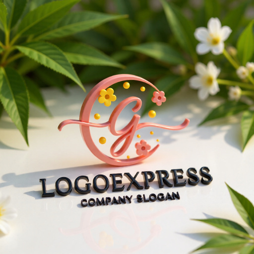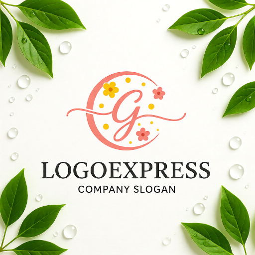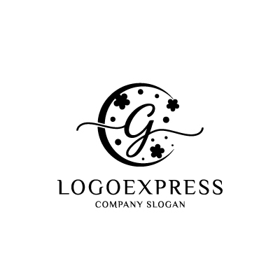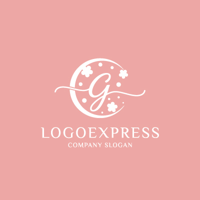 Gの筆記体文字を、優美なの弧と可愛らしい花々、そして輝くドットが囲む、フェミニンでエレガントなロゴです。