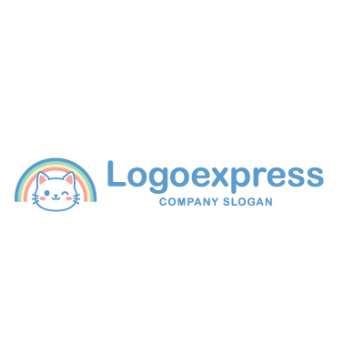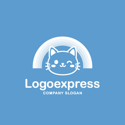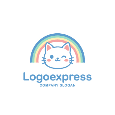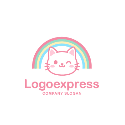 可愛らしいウインクをする猫の顔と、その上に広がるパステルカラーの虹が特徴の、優しく幸福感あふれるロゴです。
