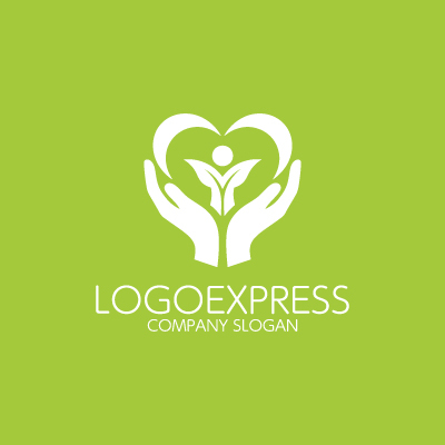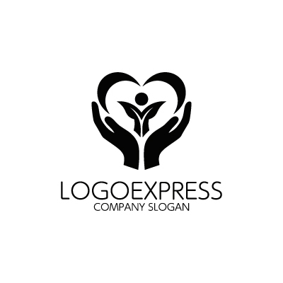 手で優しく包み込むハートの中に、葉のような腕を持つ人物が伸びやかに立つ、愛情と成長を象徴するロゴです。