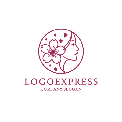優雅な女性の横顔と桜の花が描かれ、小さなハートが散りばめられた、美しく洗練されたロゴです。