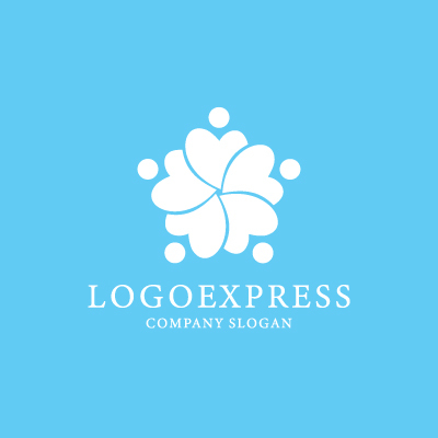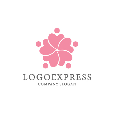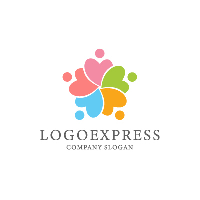五つのカラフルなハートが花のように円形に配置され、小さなドットが人々を象徴する、温かく幸福感あふれるロゴです。