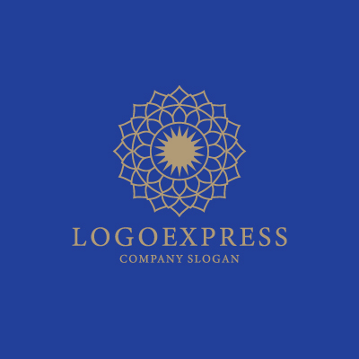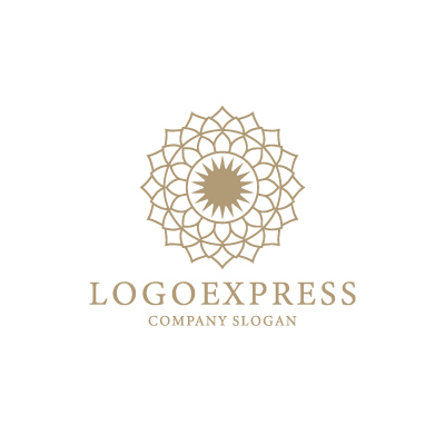このエレガントで洗練されたロゴは、中央に輝く太陽がある円形のマンダラ パターンが特徴です。