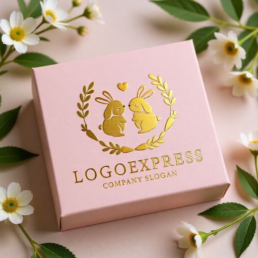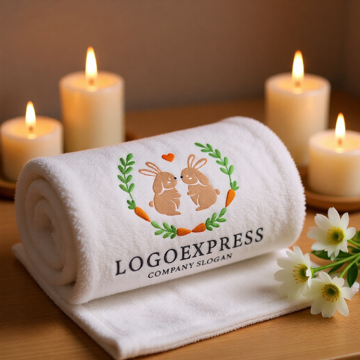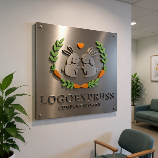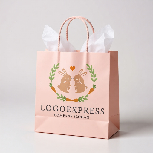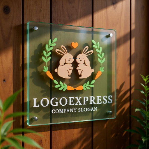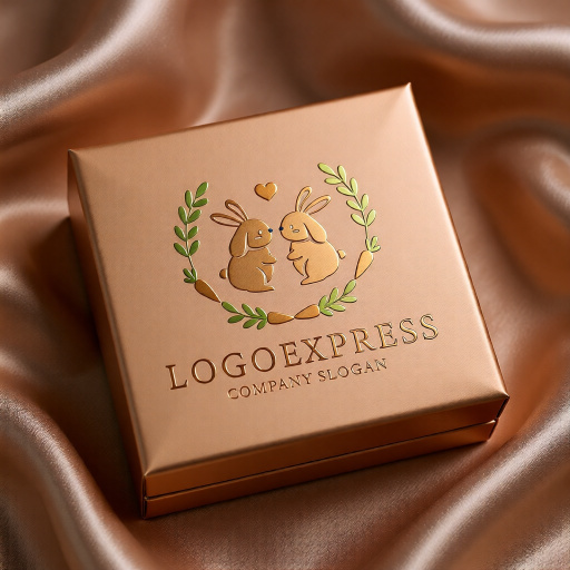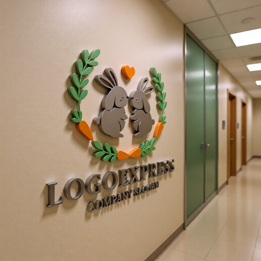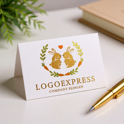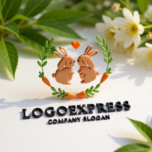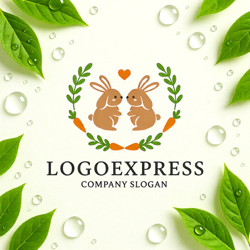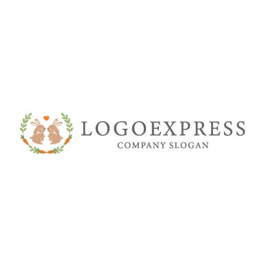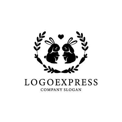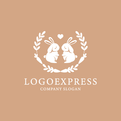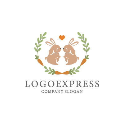 寄り添う二匹のウサギは、友情、愛情、家族、そしてパートナーシップといった「繋がり」を象徴し、見る人に温かさと幸福感を与えます。中央上部のハートは、深い愛情、思いやり、そして優しさを表現します。葉っぱと人参で構成されたリースは、自然、健康、成長、豊穣、そしてオーガニックな恵みを象徴し、企業が提供する製品やサービスが自然に優しく、健全なものであることを示唆します。淡い茶色のウサギは、穏やかさ、親しみやすさを、緑色の葉とオレンジ色のにんじんは、自然の生命力、活気、そして幸福感を象徴し、全体として明るく、安心して受け入れられるイメージを強調します。ペット関連企業、子供向け商品、オーガニック食品、農園、ウェルネス関連企業、家族向けサービスなど、愛情、温かさ、自然の恵みをアピールしたい業界に最適です。